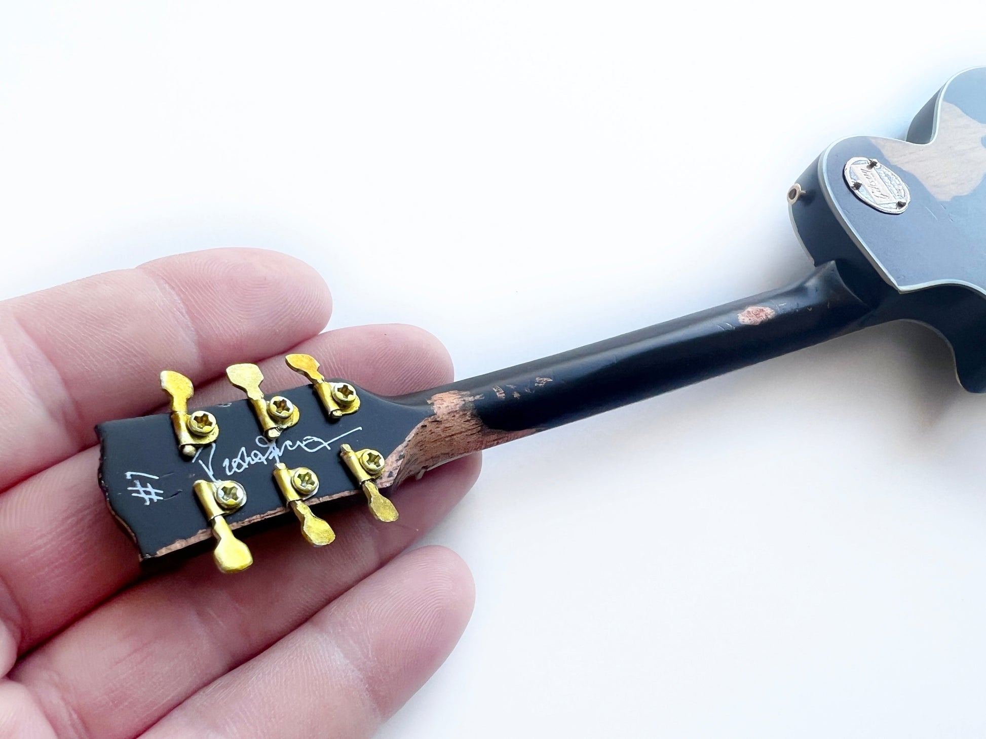 This miniature replica model honors the Holy Grail of electric guitars. The stain on this handcrafted collectible is an amazing reproduction of the original solid body instrument.